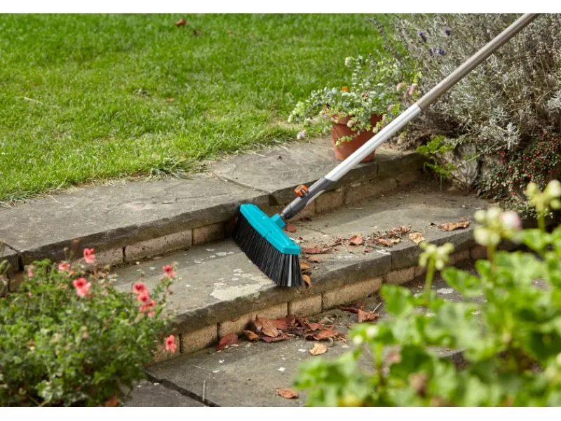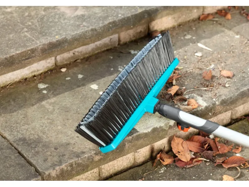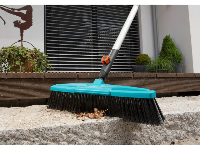 Durch eine Mischung harter und weicher Borsten entfernen Sie optimal selbst feinstes Kehrgut wie Sand und Staub. Festgetretenen Schmutz und feuchtes Laub können Sie ohne großen Aufwand mit der integrierten Kratzkante entfernen.