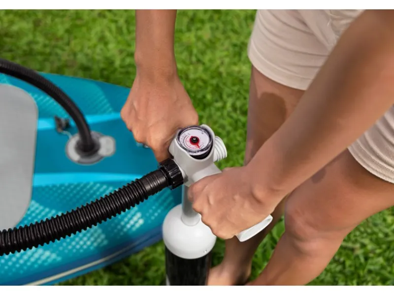 Das Set enthält alles, was du für dein Abenteuer benötigst: eine Doppelhubkolbenpumpe mit Manometer für den empfohlenen Luftdruck von 1,03 Bar, ein verstellbares 217 cm Aluminium-Paddel, das in drei Teile zerlegt werden kann, sowie ein Reparaturset, einen Transportrucksack und eine Coil Leash mit Schnelllösefunktion für zusätzliche Sicherheit.