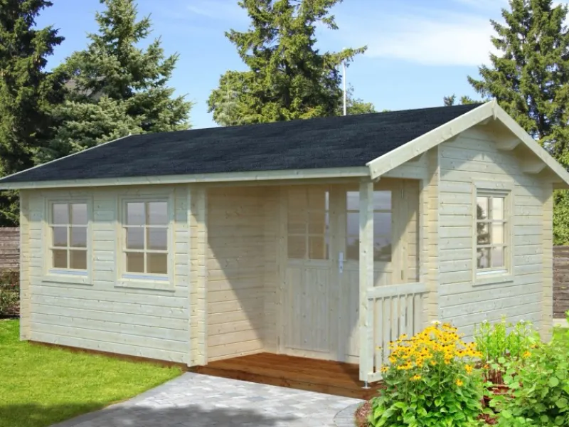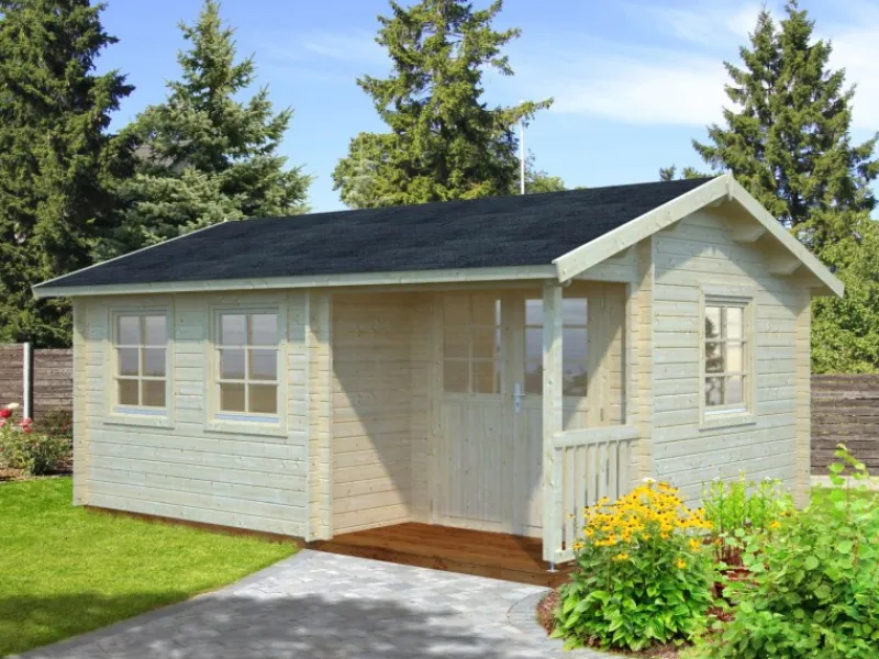 Das Gartenhaus ist aus unbehandeltem Holz in Blockbohlenbauweise gefertigt. Durch die naturbelassene Oberfläche bleibt eine natürliche Optik mit Holzmaserung erhalten. Zum Schutz vor Witterungseinflüssen sollte die Oberfläche individuell mit einer Lackierung oder Lasierung veredelt werden. Das Gerätehaus verfügt über eine robuste Konstruktion, mit einer Wandstärke von 44 mm. Die maximalen Schneelast des Satteldachs liegt bei 50 kg/m. Die Dacheindeckung ist separat erhältlich.