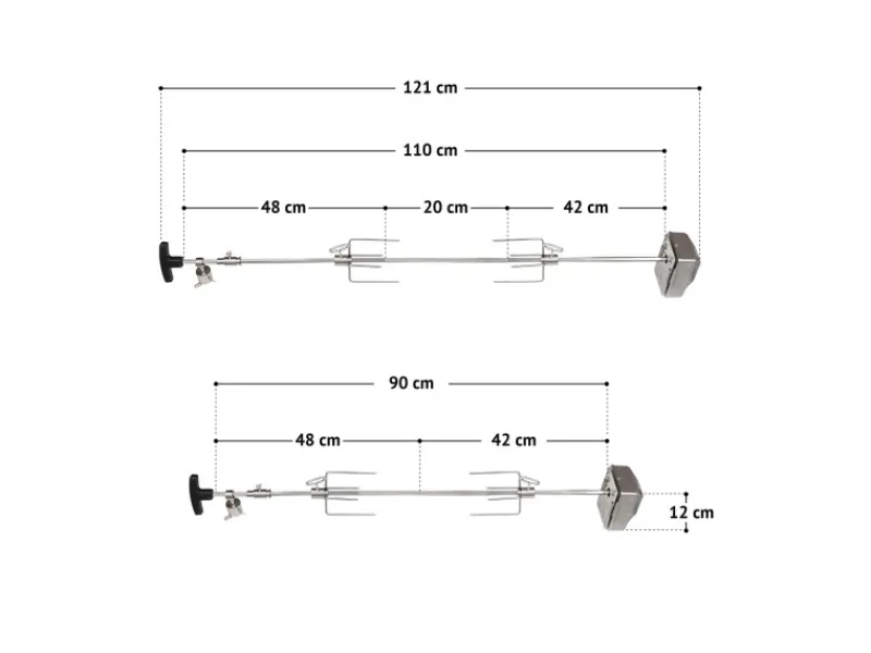 Der Grillspieß passt perfekt auf die TAINO Modelle BLACK, PLATINUM und PLATINUM YAMARA (4- und 6-Brenner). Dieser lässt sich auch dank der mitgelieferten Universalhalterung an viele verschiedene Grill-Modelle montieren und ist mit seiner flexiblen Gesamt Spießlänge von ca. 90 cm oder 110 cm auch für große Grills geeignet.