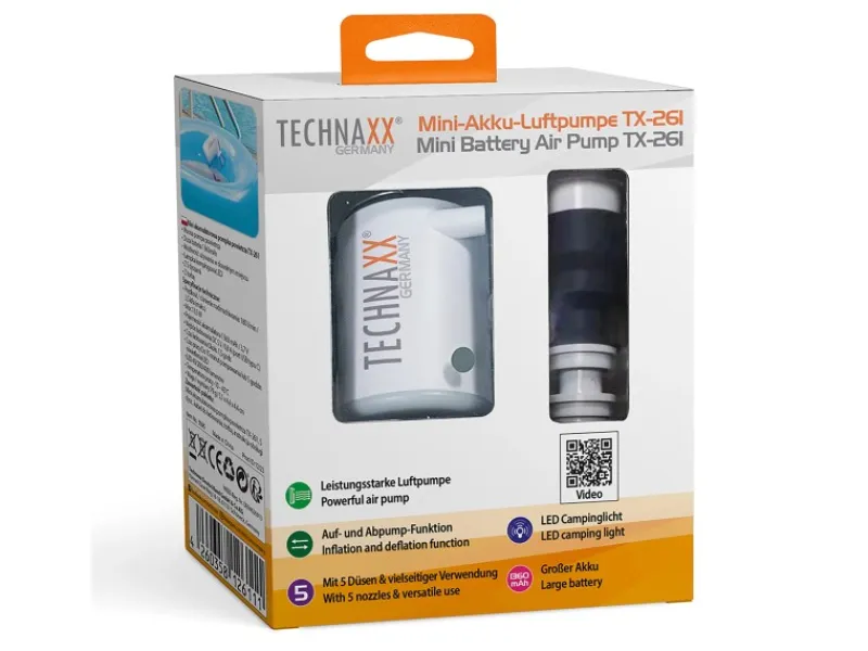 Die Mini-Akku-Luftpumpe TX-261 ist Ihre Eintrittskarte für Komfort, egal ob Sie ultimativen Komfort auf Ihren Campingausflügen, schnelle Aufbauten am Strand oder eine stressfreie Nachtruhe bietet. Entdecken Sie mit diesem außergewöhnlichen Werkzeug eine Welt voller problemloser Schlauchboote und gut beleuchteter Abenteuer. Entscheiden Sie sich für die TX-261 und lassen Sie sich von ihrer Vielseitigkeit überzeugen.