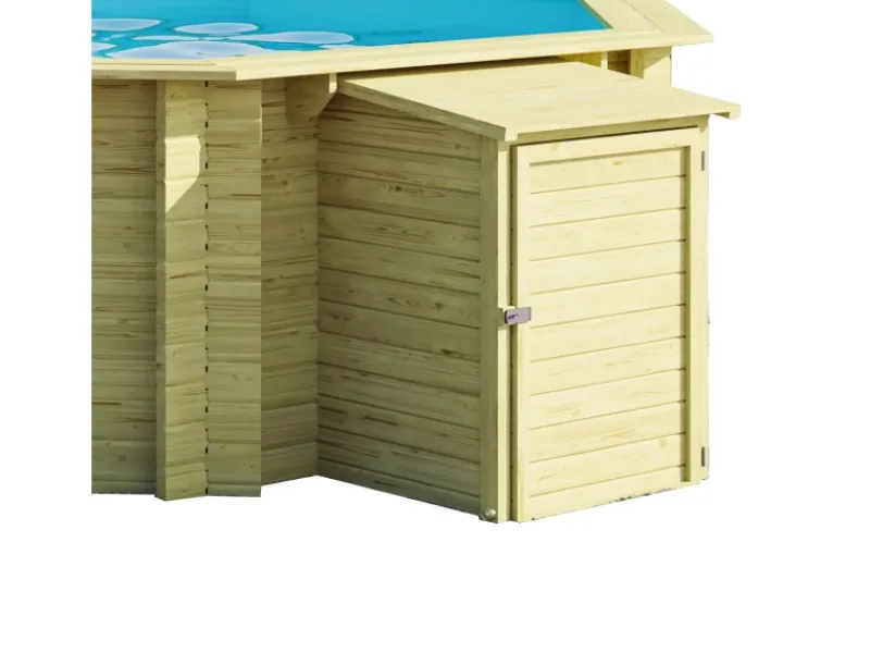 Die Massivholz Technikbox für unseren Karibu Pool aus 19 mm starken kesseldruckimprägnierter und damit witterungsbeständiger nordischer Fichte bietet Ihnen die Möglichkeit, Ihre Pooltechnik einfach und bequem zu verstauen. Durch die vormontierten Wandelemente geht der Aufbau noch leichter von der Hand.