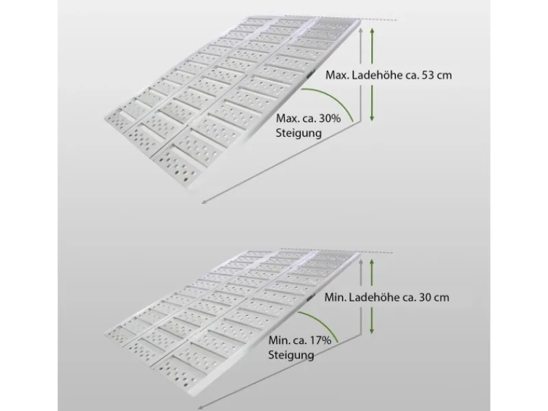 Lieferumfang: 1x DREIBREIT® by TRUTZHOLM® Auffahrrampe, montiert 2x Spanngurt zum Sichern der Rampe Bedienungsanleitung Technische Daten: Gesamtlänge (mit Auflagen) 175 cm Auffahrlänge (ohne Auflagen) 168 cm Länge Auflage 7 cm Gesamtbreite 114 cm Laufflächenbreite 113,6 cm Höhe (ausgeklappt) 4 cm Länge | Breite | Höhe (zusammengeklappt) 175 cm | 38,5 cm | 12 cm min. Auffahrhöhe 30 cm max. Auffahrhöhe 53 cm min Steigung in % | ° 17% | 9,65° max. Steigung in % | ° 30% | 16,70° Tragkraft je Stück, bei min. 80cm Achsabstand (Luftbereifung aus Gummi) 1.020 kg (340 kg je Element) Artikelgewicht je Stück 13,50 kg geeignet für Kettenfahrzeuge nein Material Aluminium Bauweise zusammenklappbar Farbe silber