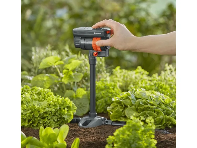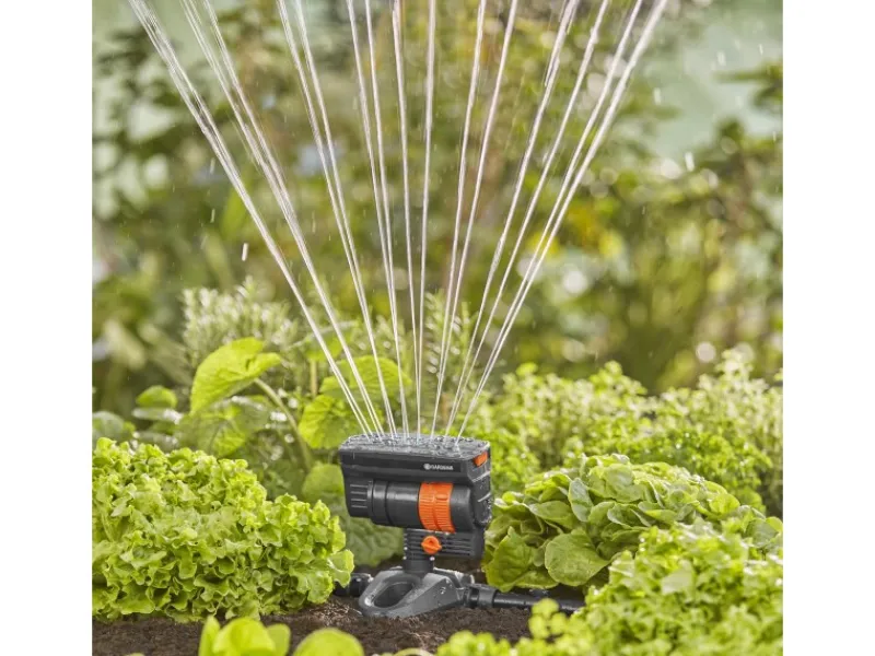 Der Viereckregner OS 90 von Gardena ist im Micro-Drip-System ideal für die flächendeckende Bewässerung von Beetpflanzen wie Gemüse, Blumen und Setzlingen geeignet. Besonders rechteckige Flächen werden durch den Regner zuverlässig bewässert. Der Viereckregner erreicht eine Fläche von 1 bis 90 m². Dank der flexiblen Regulierung kann die Sprengbreite bis 7 m und die Wurfweite bis 13 m festgelegt werden. Zudem ist die Regulierung des Wasserdurchflusses möglich. Die Installation des Regners ist aufgrund der patentierten Quick & Easy Verbindungstechnik mit integrierten Symbolen und einem Feedback-Klicken als gut hörbarem Signal in der geschlossenen Position einfach. Falls die MDS-Komponente an anderer Stelle zum Einsatz kommen soll, wird sie leicht wieder vom 13-mm-Verlegerohr gelöst. Das Verlängerungsrohr erhöht die Position des Regners, sodass eine Beregnung von oben herab auch für höhere Pflanzen gegeben ist. Die 16 Düsenausgänge des Viereckregners aus weichem Kunststoff können per Fingerwisch leicht von Kalkablagerungen gereinigt werden. Der integrierte Schmutzfilter verhindert, dass Verunreinigungen in den Viereckregner OS 90 gelangen.