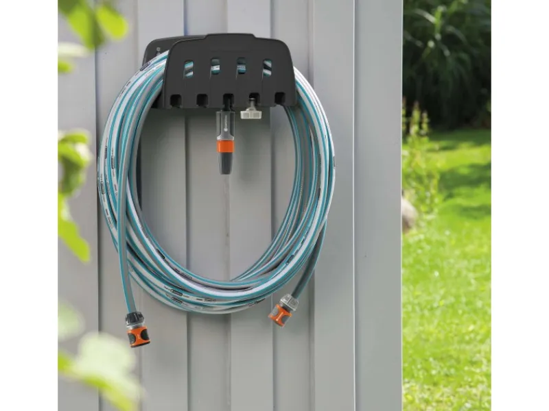 Diese Aufbewahrung bietet neben dem Wasserschlauch auch für bis zu fünf Original Gardena Bewässerungsaufsätze, wie Spritzen oder Brausen, Platz. Der Schlauch kann zum Gießen einfach und schnell von dem Wandschlauchhalter abgenommen werden. Nach dem Einsatz lässt sich der Gartenschlauch mühelos und ohne Knicke oder Knoten an dem Wandschlauchhalter wieder aufwickeln.