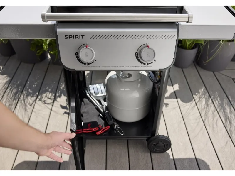 Die lackierten Seitenflächen mit integrierten Leisten können zum Abstellen von Gewürzen oder Zutaten genutzt werden und bieten Platz für Weber Works-Zubehör (separat erhältlich). Dank der seitlich montierten Weber Works Schienen mit Schnappbefestigung, ist dein Zubehör zu jeder Zeit griffbereit. Die 5 kg Gasflasche findet verdeckt im Unterschrank ihren Platz. Durch die zwei großen Räder verfügt der Weber Grill über mehr Mobilität und Stabilität und ist schnell einsatzbereit.
