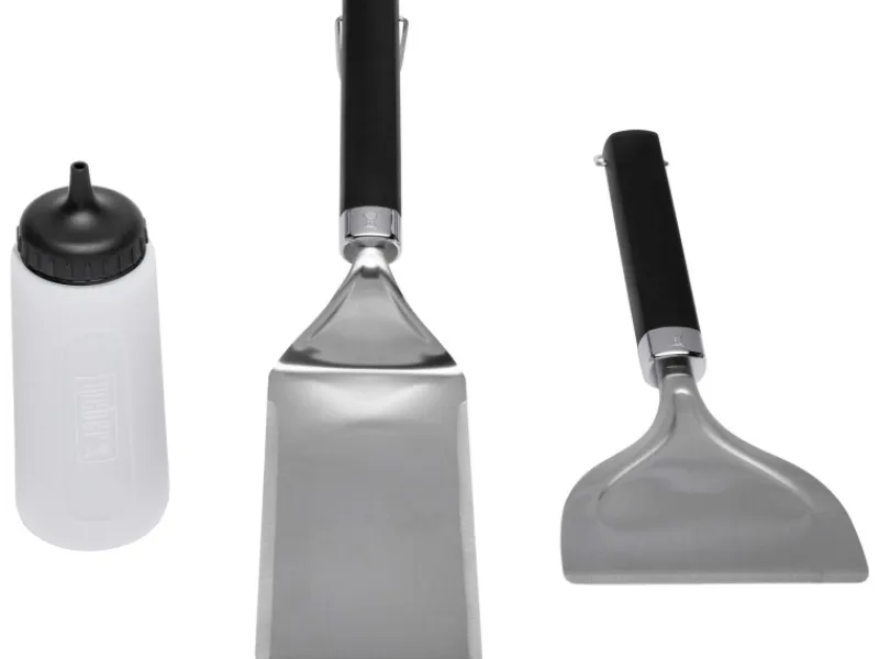 Ganz gleich, ob Sie spontan grillen möchten oder ein romantisches Abendessen geplant haben, es sind immer die Kleinigkeiten, die entscheiden. Hiermit haben Sie eine perfekte Ergänzung für Ihre Grillplatte. Mit dem 3-teilgen Zubehörset bestehend aus: einem Wender, einem Schaber für Grillplatten und eine Spritzflasche für Öl, Wasser oder Marinade.
