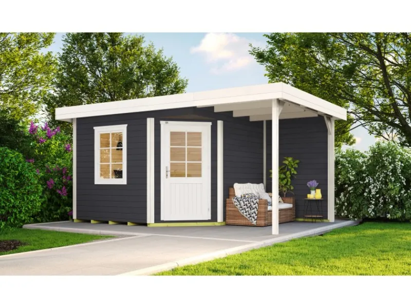 Das Gartenhaus aus Holz überzeugt durch sein modernes Design und ist dabei in schlichtem Anthrazit gehalten. Es eignet sich für den universellen Einsatz als Geräteschuppen, Gartenpavillon oder Freizeithaus.