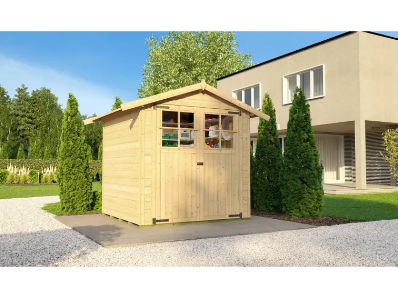 Das Gartenhaus ist im Steck- & Schraubsystem aus unbehandeltem Holz gefertigt. Durch die naturbelassene Oberfläche bleibt eine natürliche Optik mit Holzmaserung erhalten. Zum Schutz vor Witterungseinflüssen sollte die Oberfläche individuell mit einer Lackierung oder Lasierung veredelt werden. Für die Montage der Gartenlaube müssen Sie kein Profi-Handwerker sein. Dank des praktischen Steck-Schraubsystems kann die Montage problemlos durchgeführt werden und die einzelnen Teile lassen sich einfach verbinden. Das Gartenhaus verfügt über eine stabile Konstruktion, mit einer Wandstärke von 19 mm. Das Dach des Gerätehauses ist als Satteldach gestaltet. Die Dacheindeckung ist separat erhältlich.