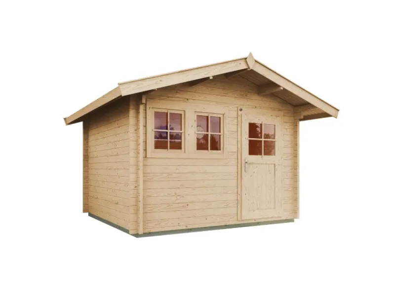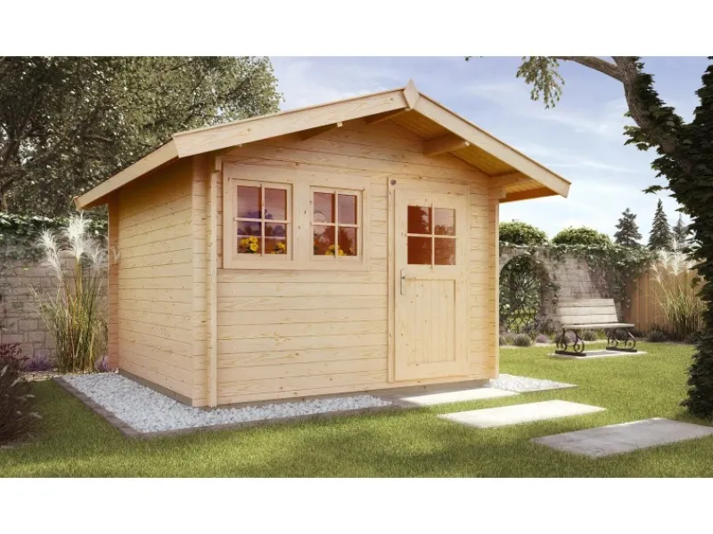 Das Gartenhaus ist aus unbehandeltem Holz im Steck- & Schraubsystem gefertigt. Durch die naturbelassene Oberfläche bleibt eine natürliche Optik mit Holzmaserung erhalten. Zum Schutz vor Witterungseinflüssen sollte die Oberfläche individuell mit einer Lackierung oder Lasierung veredelt werden. Für die Montage der Gartenlaube müssen Sie kein Profi-Handwerker sein. Dank des praktischen Steck-Schraubsystems kann die Montage problemlos durchgeführt werden und die einzelnen Teile lassen sich einfach verbinden. Das Gerätehaus verfügt über eine stabile Konstruktion, mit einer Wandstärke von 45 mm. Die maximalen Schneelast des Satteldachs liegt bei 76 kg/m. Die Dacheindeckung ist separat erhältlich.