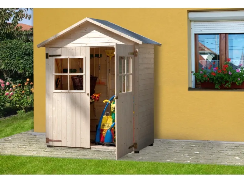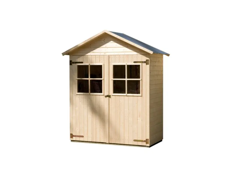Garten- & Terrassenschrank in Elementbauweise, naturbelassen, 14 mm Wandstärke, mit 14 mm Massivholz-Satteldach, 19 mm Massivholzboden