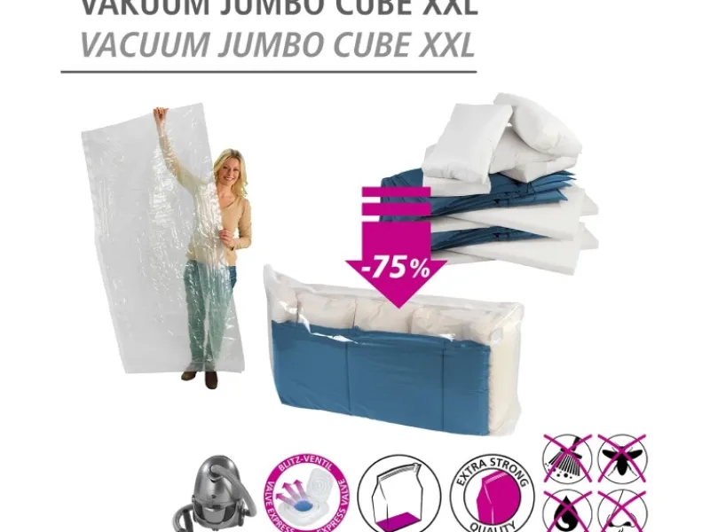 Der Jumbo Vakuum-Beutel mit der Größe XXL (180 x 90 x 50 cm) ist mit einer praktischen Standfläche für noch größeres Fassungsvermögen ausgestattet. Der große Vakuum-Sack bietet ideale Aufbewahrungsmöglichkeiten für besonders große und sperrige Gegenstände wie z.B. Kinderwagen oder Gartenmöbelauflagen. Das Volumen der Decken oder Polster wird auf ein Minimum reduziert. Staub, Nässe und Motten werden in diesem geschützten Behältnis von dem Inhalt fern gehalten. Die extra dicke Folienqualität eignet sich für Langzeitaufbewahrung.