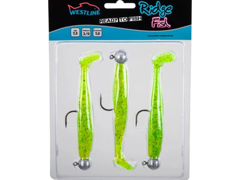 Das Westline Angelhaken Set Ridge Fish Kit 7,5 cm CBGG Grün besteht aus jeweils 3-4 Gummifischen (je nach Länge) welche bereits fertig auf den Jigkopf aufgezogen sind. Die im Set enthalten Rundbogen-Jig Haken sind aus besten High-Carbon Stahl gefertigt und sind ultrascharf. Die Gummifische sind aus einer widerstandsfähigen und zugleich weichen Gummimischung gefertigt , sodass sie auch mehrere Bisse überstehen und trotzdem verführerisch laufen. Mit ihrer schlanken Form lassen sie sich weit und zielgenau werfen und sind prädestiniert für Zander und Barsch. Echte High-Tech Gummies in den fängigsten Farben.