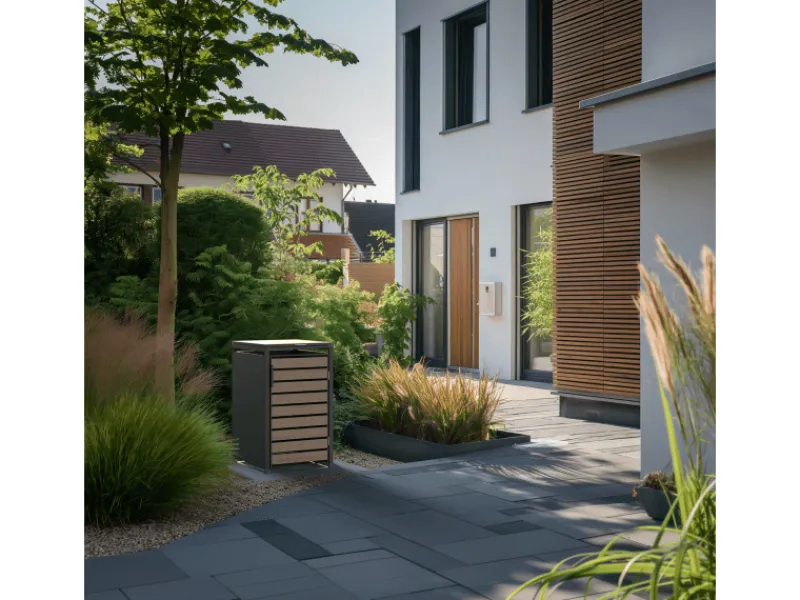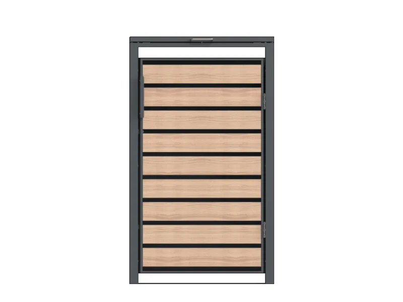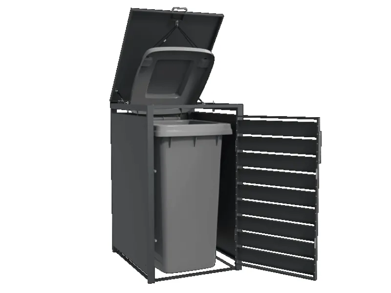 Um deine Mülltonne zu befüllen, lässt sich die Mülltonnenbox einfach per Deckel öffnen. Die am Deckel angebrachten Gasdruckfedern verhindern das unkontrollierte Zufallen des Deckels, sodass das Befüllen der Mülltonne problemlos und ohne Verletzungsrisiko möglich ist. Dank der leichtgängigen Fronttür lässt sich die Tonne mühelos in die Box hineinschieben. Neben der sichtbaren Aufwertung schützt die Mülltonnenbox deine Mülltonne auch vor starker Sonneneinstrahlung und beugt somit intensiver Geruchsentwicklung vor.