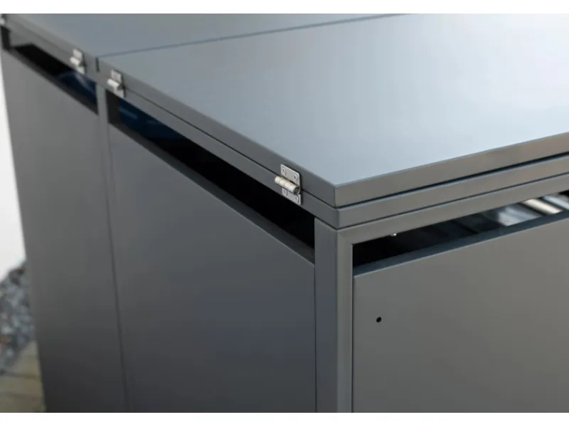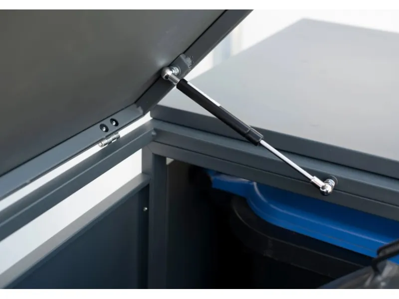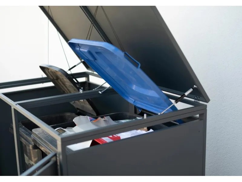 Um Ihre Mülltonne zu befüllen, lässt sich die Mülltonnenbox einfach durch den Deckel öffnen. Die am Deckel angebrachten Gasdruckfedern verhindern ein unkontrolliertes Zuklappen – das Befüllen der Mülltonne ist somit problemlos und ohne Verletzungsgefahr möglich.