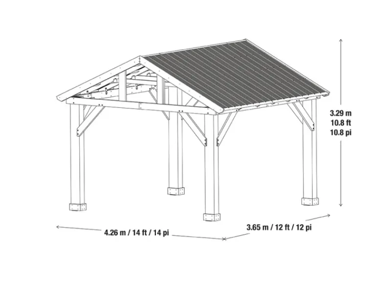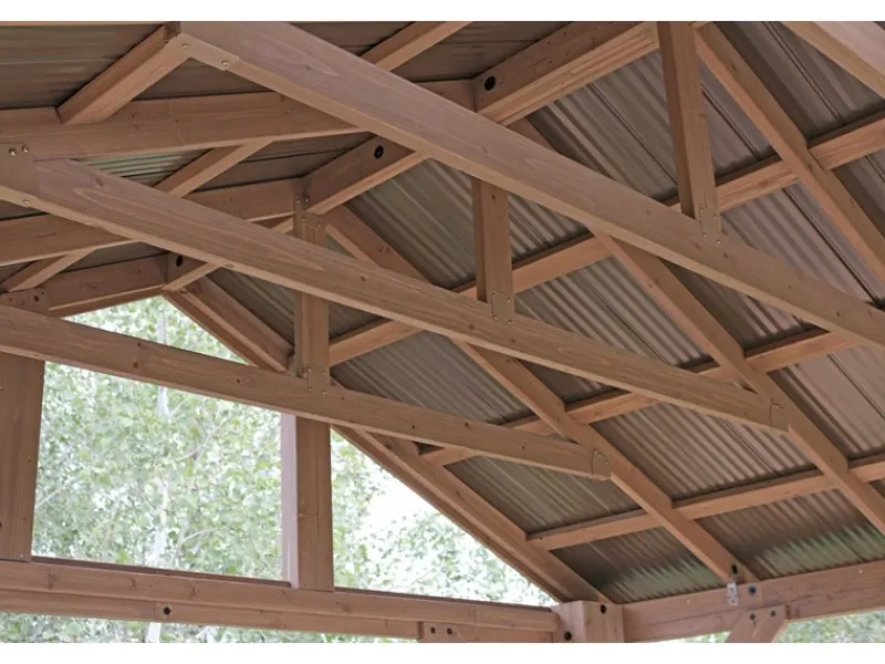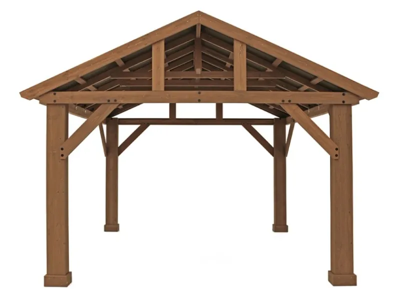 Der Westmann Pavillon ist ein Holzpavillon mit Bronze-Aluminium-Dach. Der Gartenpavillon ist hergestellt aus 100 % FSC-zertifiziertem Cedar-Holz. Dadurch fügt er sich dank der naturbelassenen Beize in Mokkabraun auch ganz natürlich und dezent in sein Umfeld ein.