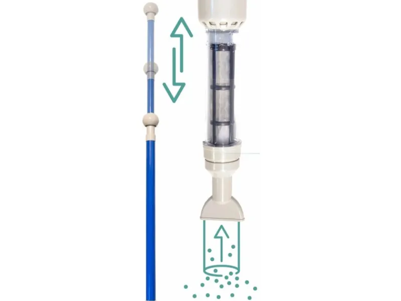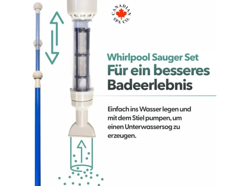 Es ist für den Deluxe Whirlpool Sauger kein Stromanschluss, keine Schläuche und kein Wasseranschluss erforderlich. Legen Sie ihn einfach ins Wasser und pumpen Sie den Griff, um einen Unterwassersog zu erzeugen. Das Wasser wird in den Sauger gesaugt und durch einen eingebauten Filter ohne die Verunreinigungen wieder in den Whirlpool zurückgeführt.
