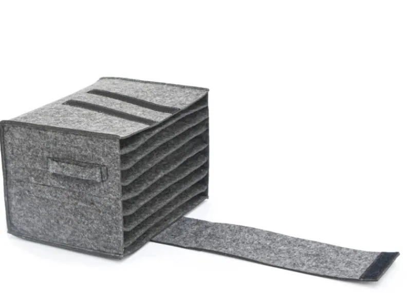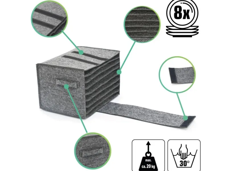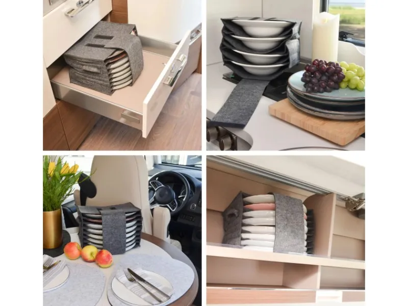 Runde, eckige, große oder kleine Teller: Hier passt alles rein – sogar Suppenteller! Der Halter aus Filz ist viel anpassungsfähiger als Schaumstoff, seine Fächer dehnen sich flexibel aus.